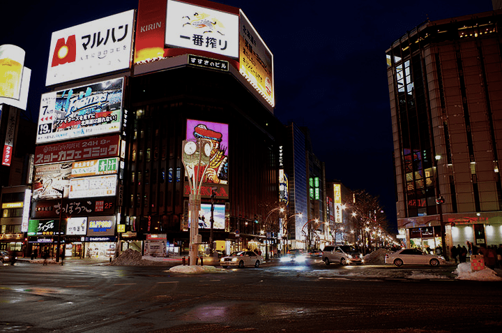 Susukino is the most crowded area of Sapporo, Hokkaido. Shopping stores, restaurants and bars are densely built and you can find any type of cuisine from local ramen, soup curry, mutton BBQ to seafood.